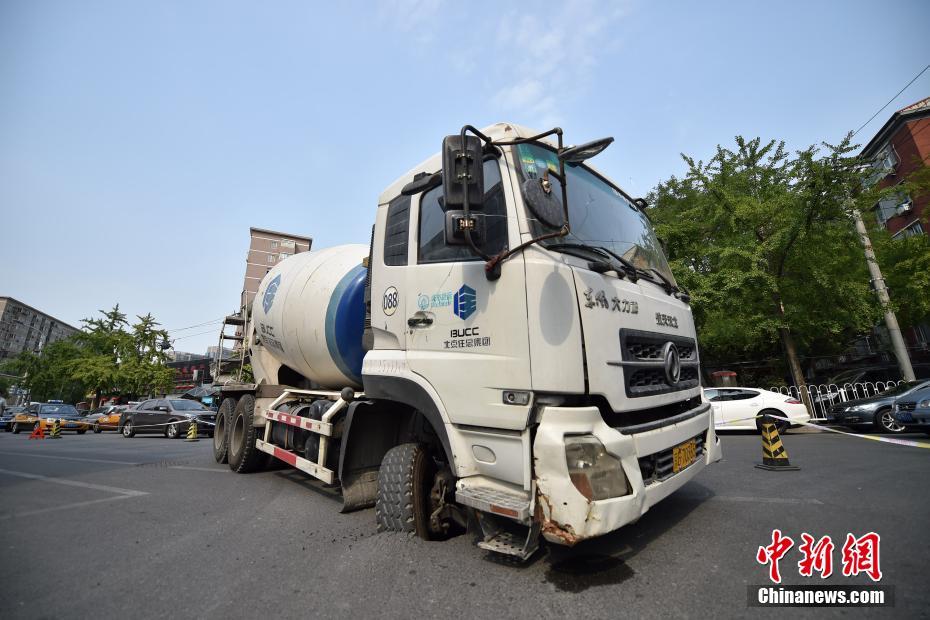 北京一水泥罐车压塌马路 前轮深陷动惮不得