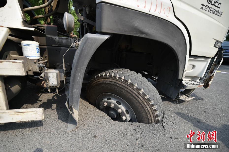北京一水泥罐车压塌马路 前轮深陷动惮不得