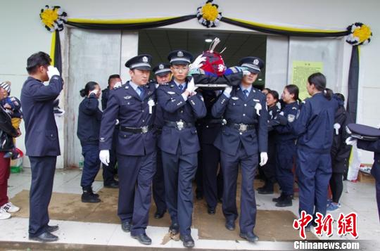 中新网成都6月16日电 (汤雁 邹立杨) 16日上午,四川省凉山州布拖县公安局牺牲民警贾巴伍各追悼会在布拖县殡仪馆举行。800多名各族干部、群众和家属参加遗体告别仪式。四川省委政法委、省公安厅、凉山州委州政府相关领导参加了追悼会。