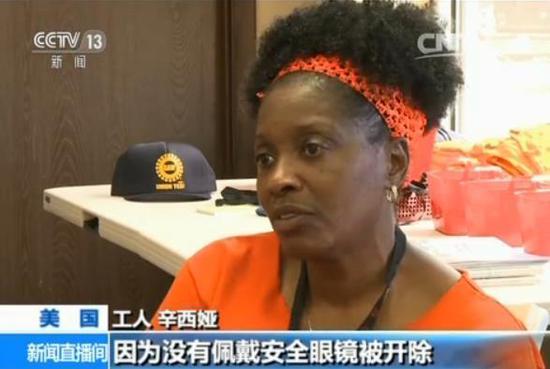 工人辛西娅:我看到一些美国员工因为没有佩戴安全眼镜,没有关闭防烟门被开除。但是如果你看到中国员工,他们很多人不戴安全眼镜,不戴防护设备,不穿安全鞋。如果有美国人因为这些原因被开除,那这些规定应当适用于所有人。我希望如果有一天我如果去医院看病,我可以以这个理由去看病,而不是被记一个过。