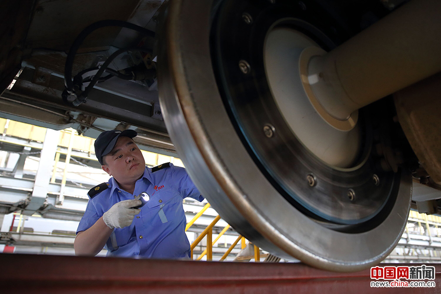 2017年6月26日早,北京铁路局北京动车段北京南动车运用所一级修车间,甲班三组的检修人员对即将出库的中国标准动车组“复兴号”进行检测,在车内进行设备调试,在车底走行部位检查,然后由北京机务段的高铁司机将“复兴号”从动车段的车库开往始发地北京南站。25日,由中国铁路总公司牵头组织研制、具有完全自主知识产权、达到世界先进水平的中国标准动车组被命名为“复兴号”。26日,中国标准动车组“复兴号”率先在京沪高铁两端的北京南站和上海虹桥站双向首发。中国网记者 陈维松 摄