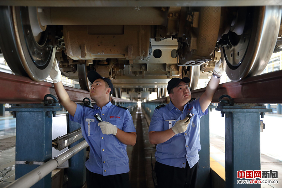 早8时45分,检修人员丁东旭(画面右)和贾虹升检查车底转向架。