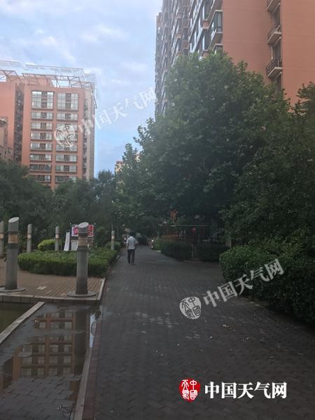 今晨,石景山一小区地面潮湿,还有少量积水。