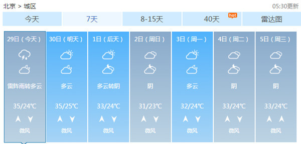 北京市气象台今天6时发布预报,预计今天白天多云,午后大部地区有雷阵雨或阵雨,最高气温35℃;夜间多云转晴,西部北部山区有雷阵雨或阵雨,最低气温24℃。