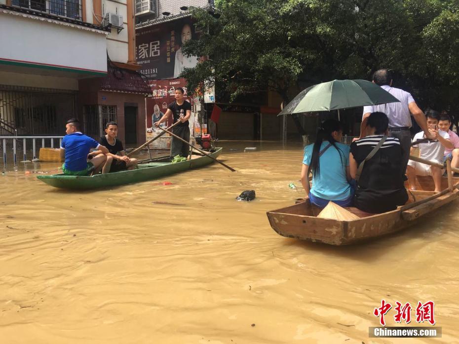 广西融水县遇洪水 县城被泡居民乘船出行