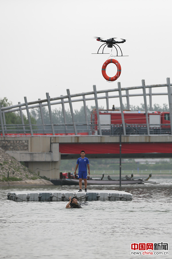 救援队员为帮助落水群众逃生自救,远距离操控无人机向落水者空投救生圈。中国网记者 陈维松 摄