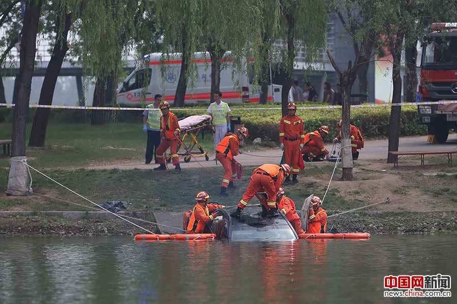 06 在车辆涉水事故救援演练环节,救援人员对涉水车辆进行稳固,避免车体继续下滑沉入水中,再对车体实施破拆,营救车内被困人员。中国网记者 陈维松 摄