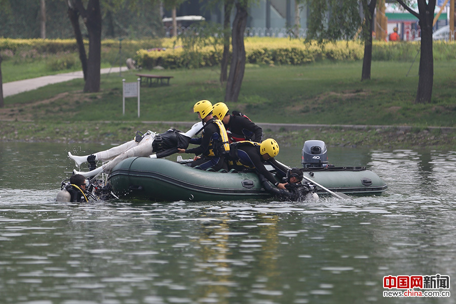 在群众落水事故救援演练环节,潜水员下水救出溺水人员。中国网记者 陈维松 摄