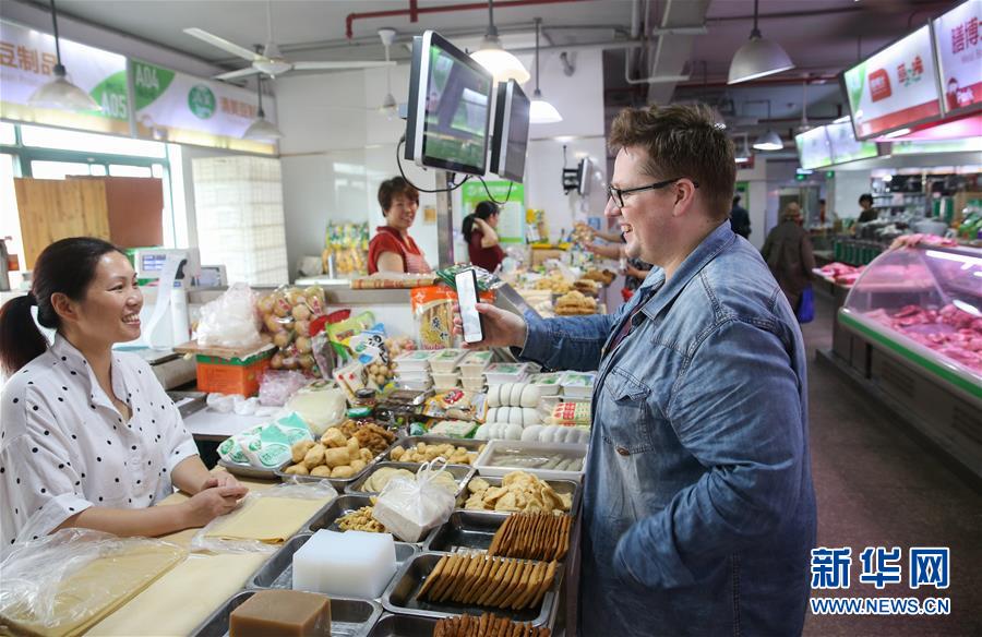 阿福在上海一家菜场买菜时使用手机支付费用(6月22日摄)。新华社记者 丁汀摄