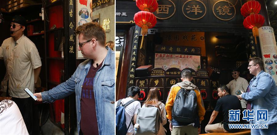 阿福在上海城隍庙观看“西洋镜”表演,并使用手机支付费用(拼版照片,6月22日摄)。新华社记者 丁汀摄