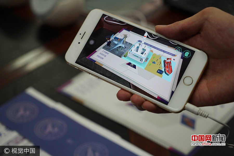2017年7月4日下午5时,中国第一封AR录取通知书从陕西西北工业大学发出。扫描通知书背面后即可出现“航空航天航海”的立体动画。苟秉宸/视觉中国