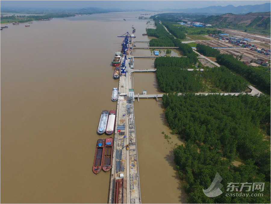 黄石新港一期总占地面积为1032亩,建设散货堆场、件杂堆场、集装箱堆场以及生产生活设施,六横六纵的道路交通网将港区分隔成不同的功能分区。港区进行方格式绿化布置,不仅有利于美化港区环境,还能净化空气、吸附粉尘、降音降噪,将生产性的港口打造成环境优美的花园式港区。图为航拍的黄石新港一角。