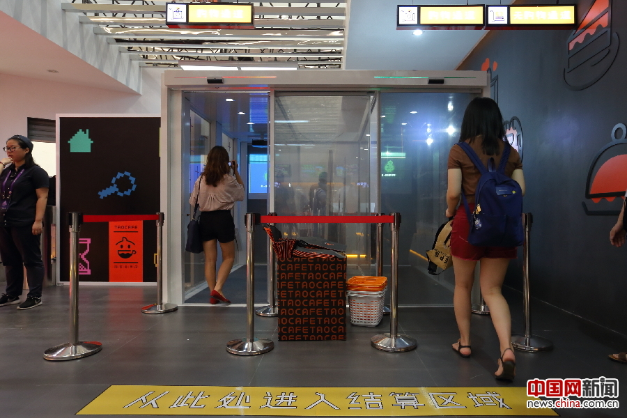 2017年7月8日,浙江杭州国际博览中心,阿里巴巴在第二届淘宝造物节上推出阿里无人超市“淘咖啡”。它是一家集购物与餐饮于一体的无人店,顾客可以扫手机进店,然后在店里自己选购商品,在出店的时候,柜台将自动计算商品的价格,客户利用支付宝支付。中国网记者 陈维松 摄