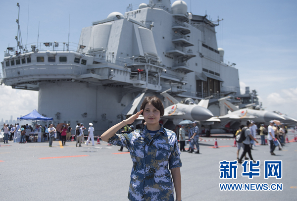 一位女兵刚在甲板现身,就受到香港市民“围观”。这位来自新疆的哈萨克族女兵名叫加德热拉·哈布力,白皙的皮肤,深邃的眼睛,配上一身帅气的海军服,她的出现让香港市民纷纷赞叹“好靓啊!”