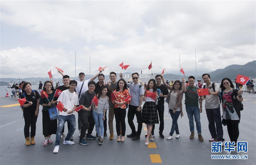 7月9日,香港市民在辽宁舰的飞行甲板上留影。