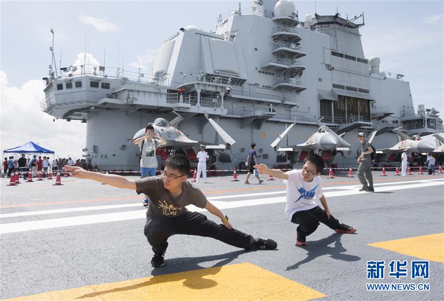 7月9日,两名青少年在辽宁舰的飞行甲板上模仿“航母STYLE”动作。