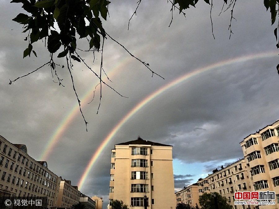 2017年7月11日,内蒙古牙克石市一场阵雨过后,天空出现双彩虹。余昌军/视觉中国