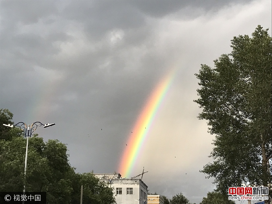 2017年7月11日,内蒙古牙克石市一场阵雨过后,天空出现双彩虹。余昌军/视觉中国