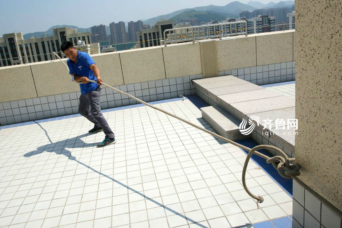 葛延桂工作的空调安装站点,承担着济南整个东部地区用户的安装和售后。进行高空作业前,葛延桂需要爬到顶楼对绳索进行固定。齐鲁网记者 尹承谦摄