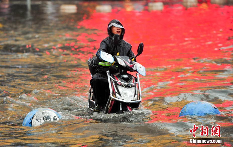 7月14日,辽宁沈阳,市民趟水过马路。当日,沈阳市气象台当日17时发布雷雨大风黄色预警信号。中新社记者 于海洋 摄