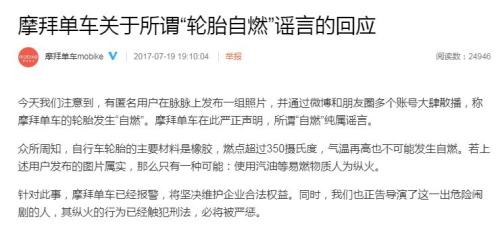 7月19日,摩拜单车官方微博发布信息称,19日,有匿名用户在脉脉上发布一组照片,并通过微博和朋友圈多个账号大肆散播,称摩拜单车的轮胎发生“自燃”。摩拜单车通过官方微博声明,所谓“自燃”纯属谣言。