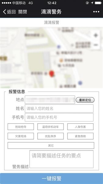 点进“滴滴报警”平台,系统自动定位,输入姓名和手机号,选择警情,即可报警。微信截图