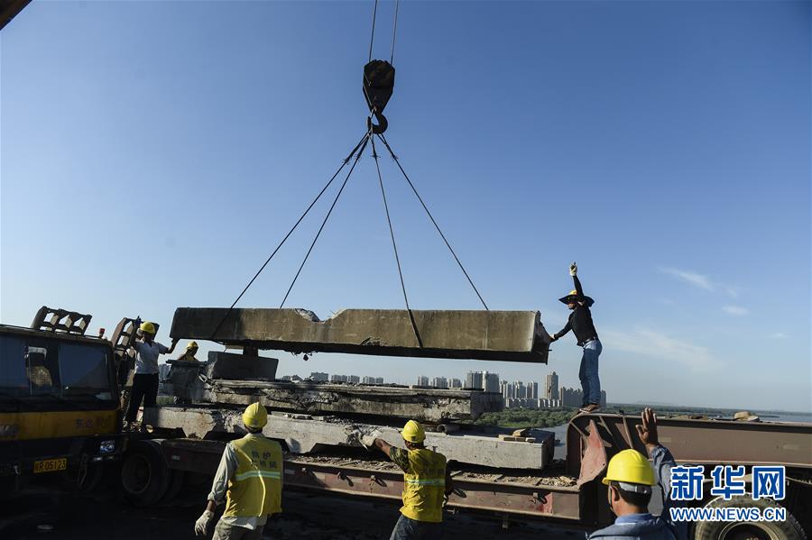7月20日,工人在大桥上吊卸拆解的桥板。