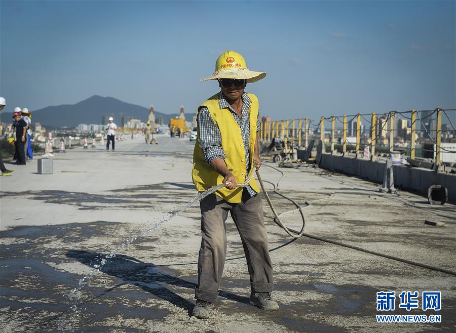 7月20日,工人在往桥面上洒水,除尘降温。