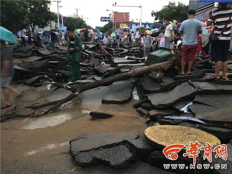 7月23日下午4时20分左右,榆林城区突然下起了大雨,多个路段因为地势较低,发生严重积水,甚至有车辆及行人被激流冲走,部分道路坍塌。图片来源:华商网-华商报