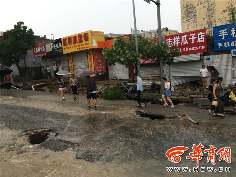 7月23日下午4时20分左右,榆林城区突然下起了大雨,多个路段因为地势较低,发生严重积水,甚至有车辆及行人被激流冲走,部分道路坍塌。图片来源:华商网-华商报