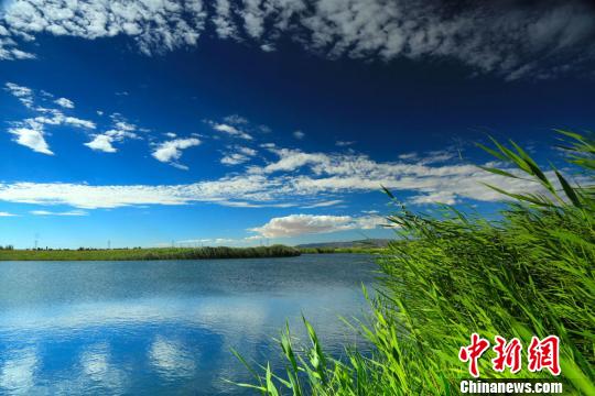 图为天空湛蓝、芦苇青青,水天一色。 陈礼 摄