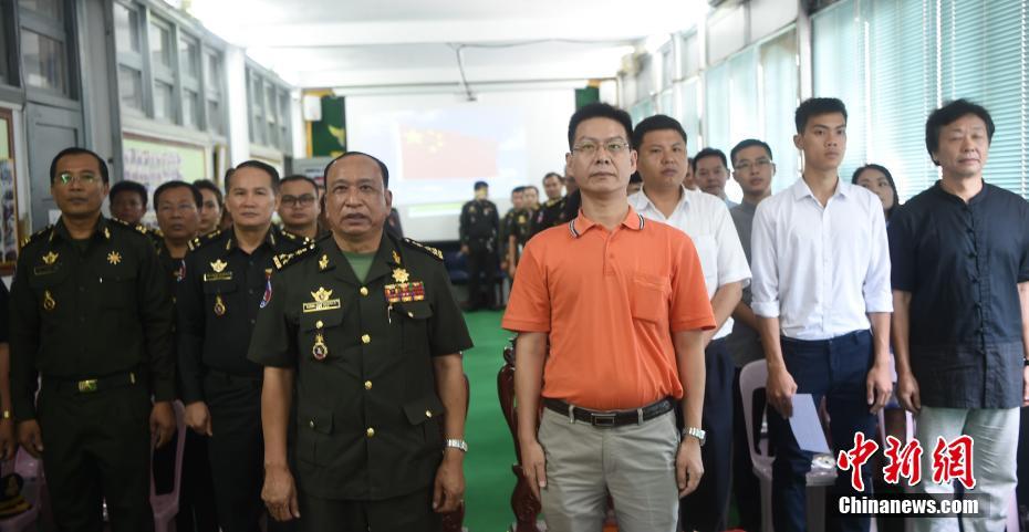7月31日,柬埔寨国防部举行“传承与创新——中国非遗展”,让柬埔寨官兵感受中国非物质文化遗产的博大精深。图为中国武汉市国际文化交流中心联络部部长谢德伟(前右)与柬埔寨国防部军队民事事务局局长桑萨仁上将(前左)在开幕式上。中新社记者黄耀辉 摄