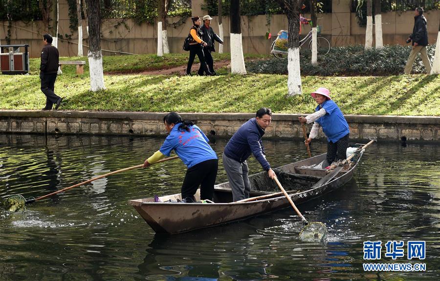 云南昆明福海街道办新河社区的村级“河长”杨枫(前中)和工作人员在流入滇池的船房河上打捞垃圾和杂物(2017年1月6日摄)。“河长制”是中国生态文明建设的一个新实践。新华社记者蔺以光 摄