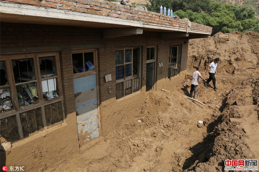 图为子洲张家寨,男子用铁锹往外挖堆积在院里的淤泥。刘小东/东方IC