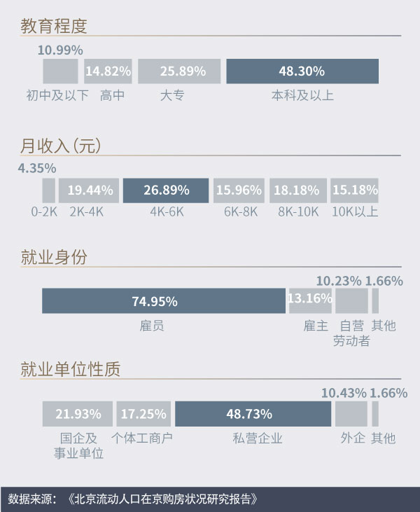 如果用一句话描绘北京购房流动人口,他们中的大多数会是这样一群人:年龄在28-47岁之间,大专以上学历,月收入在4000元以上,在京流动时间为5至10年,大多是在国企、私企工作的职员或个体工商户,并且是有社会保险的已婚人士。