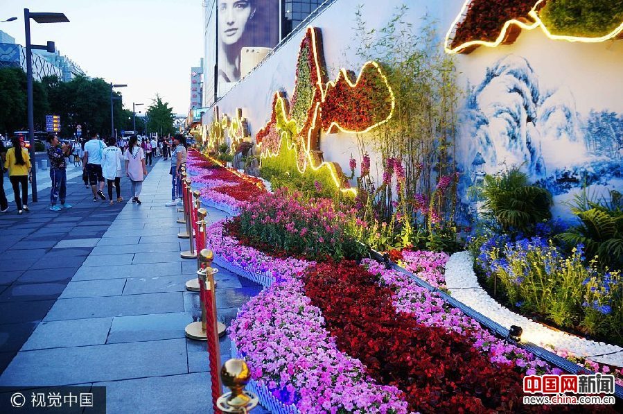 2017年8月3日,北京,西单大街上搭建的中国山水花坛街景在炎炎夏日中喷射出浓浓白雾,不仅美化了城市街景,也为购物逛街的市民带来了稍许清凉。樊甲山/视觉中国
