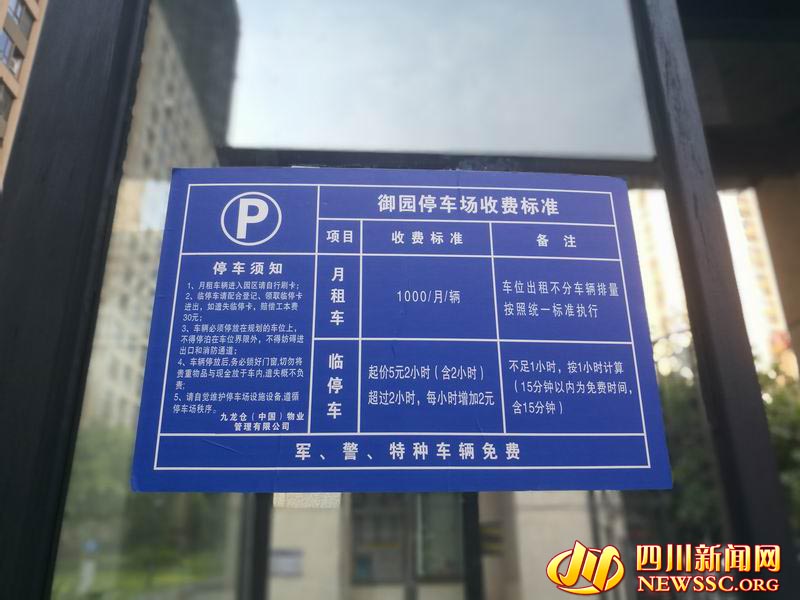 九龙仓·御公馆是楼盘4期,楼盘1、2、3期在马路对侧的九龙仓·御园,该区域业主周林一家2014年1月入住。据周林介绍,起初,小区地下停车场免费对业主开放,然而,去年10月,物业在每栋电梯口贴出了一张通知,称小区地下停车场将于2016年10月15日进行收费:月租车辆每月1000元(含90元管理费);临停车辆按时收费,前两个小时5元,超过两小时,每小时2元。