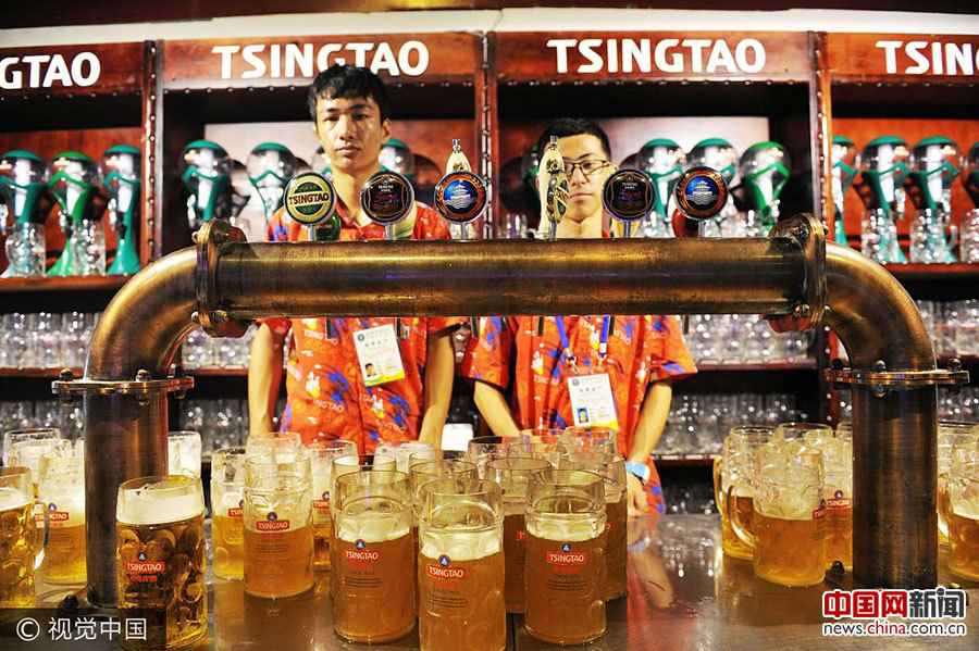 2017年8月7日,山东青岛金沙滩啤酒城啤酒大棚内,服务人员为顾客准备好扎啤。俞方平/视觉中国