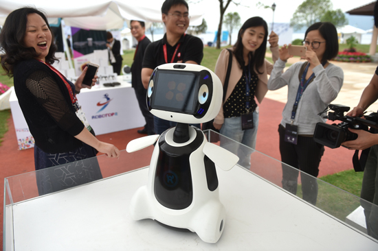 2017年5月16日,在第四届中国机器人峰会上,观众在现场与机器人互动 黄宗治/摄