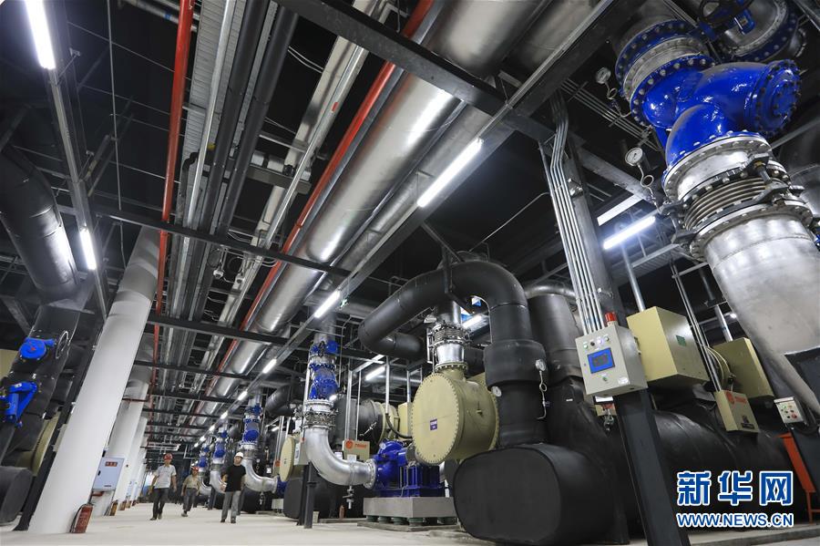 8月14日,技术人员在江水源1号能源站地下车间巡查设备运行情况。新华社记者 刘潺 摄