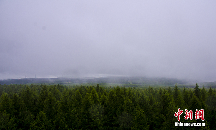 塞罕坝森林公园中坐落着一块孤立巨岩,此岩石被称作“亮兵台”,它周围有人工林几万亩,草原、森林、山川浑然有序。图为在亮兵台眺望雨中林场景色。中新网记者 张舰元 摄