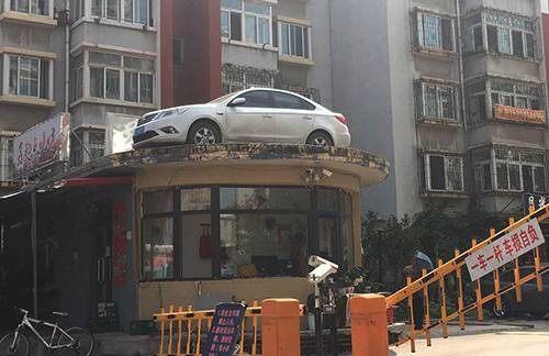 女子用轿车堵小区门 车被吊上房