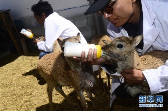 可可西里索南达杰保护站协警解安程(右)在藏羚羊救护中心内给小藏羚羊喂奶(8月15日摄)。