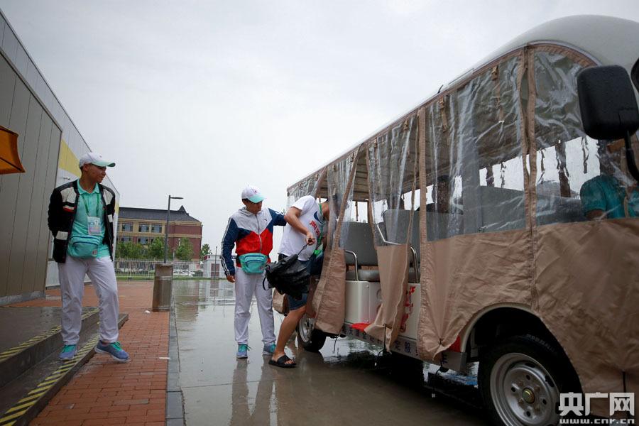 工作人员给摆渡车穿上了“雨衣”,为记者出行提供便利。