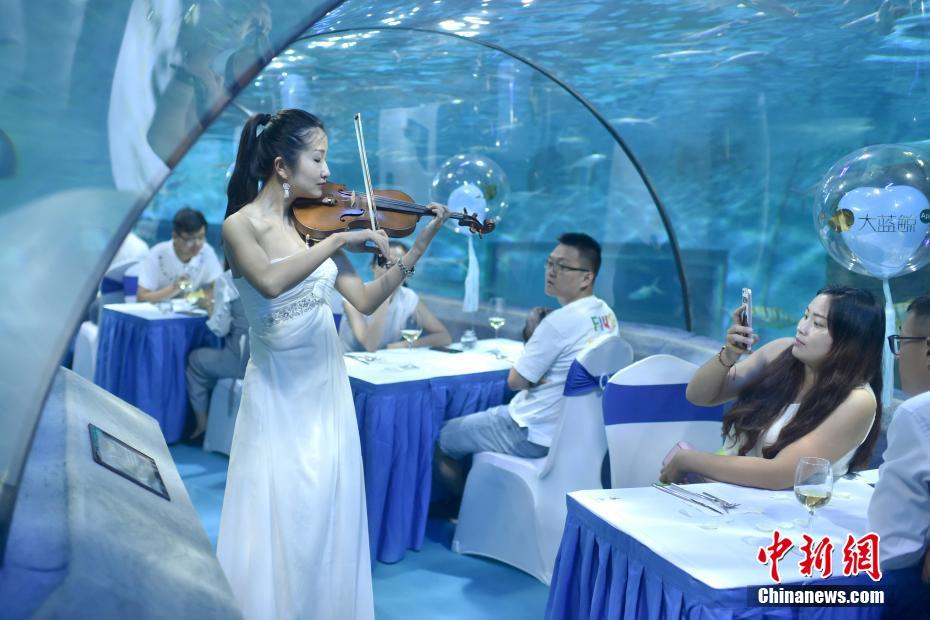 8月28日晚,主题为“摩登派七夕”的海底晚宴在南京海底世界举行,通过江苏音乐广播征集来的市民边观看海洋生物边品尝美食。中新社记者 陈俨 摄