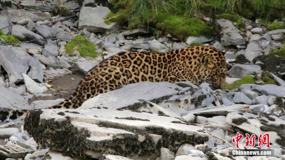 8月29日,四川甘孜州炉霍县泥巴乡境内发现一只野生花豹,该只花豹体长超过1米,其在河边滞留约5个小时后返回森林。中新社发杨孝康摄