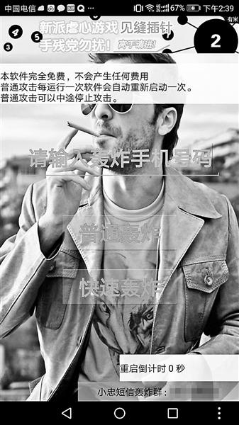 北青报记者调查发现,“验证码轰炸机”软件确实可以在网上轻易下载,只要在网上搜索“短信轰炸”关键词,就会找到大量的软件下载地址。“轰炸软件”一般分为两种,免费试用版仅能使用几分钟,付费版则可以连续“轰炸”。