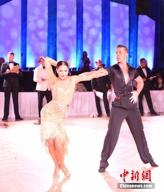 2017年度“大使杯”国标舞锦标赛暨世界师生组国标舞锦标赛8月30日至9月3日在美国加州尔湾市举行。中国国际标准舞总会(CBDF)率代表团参赛,在摩登舞等项目上夺得冠军佳绩。图为比赛现场。 中新社记者 张朔 摄