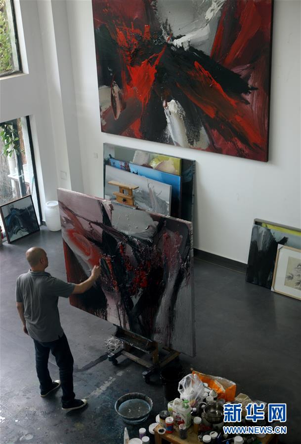 韩中人在画室作画(9月2日摄)。新华社记者 吴晓初 摄