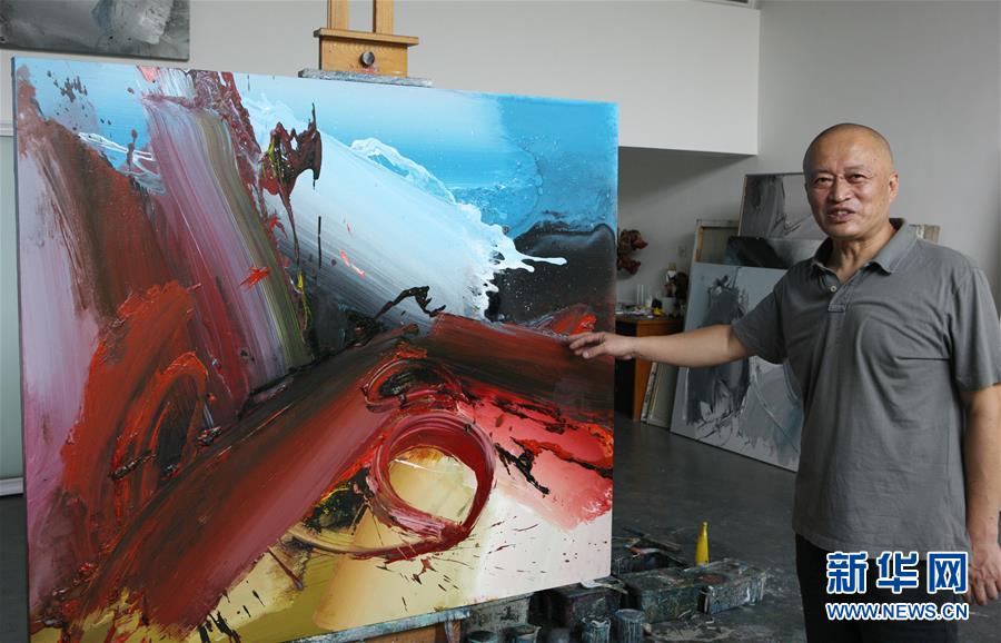 韩中人在画室介绍自己的画作(9月2日摄)。新华社记者 吴晓初 摄